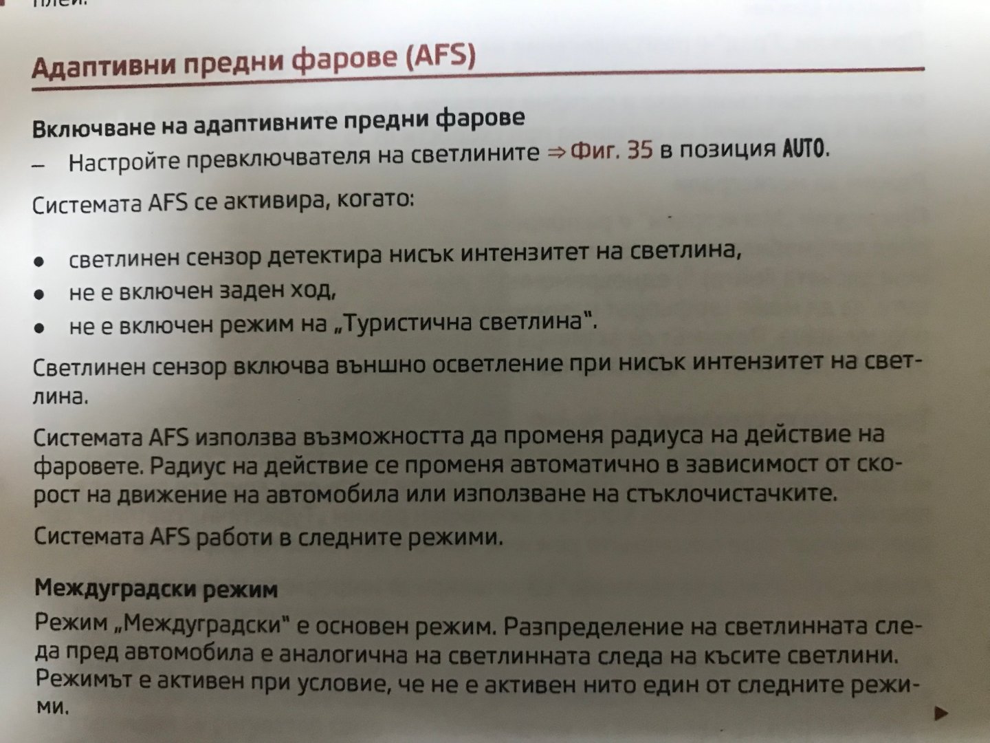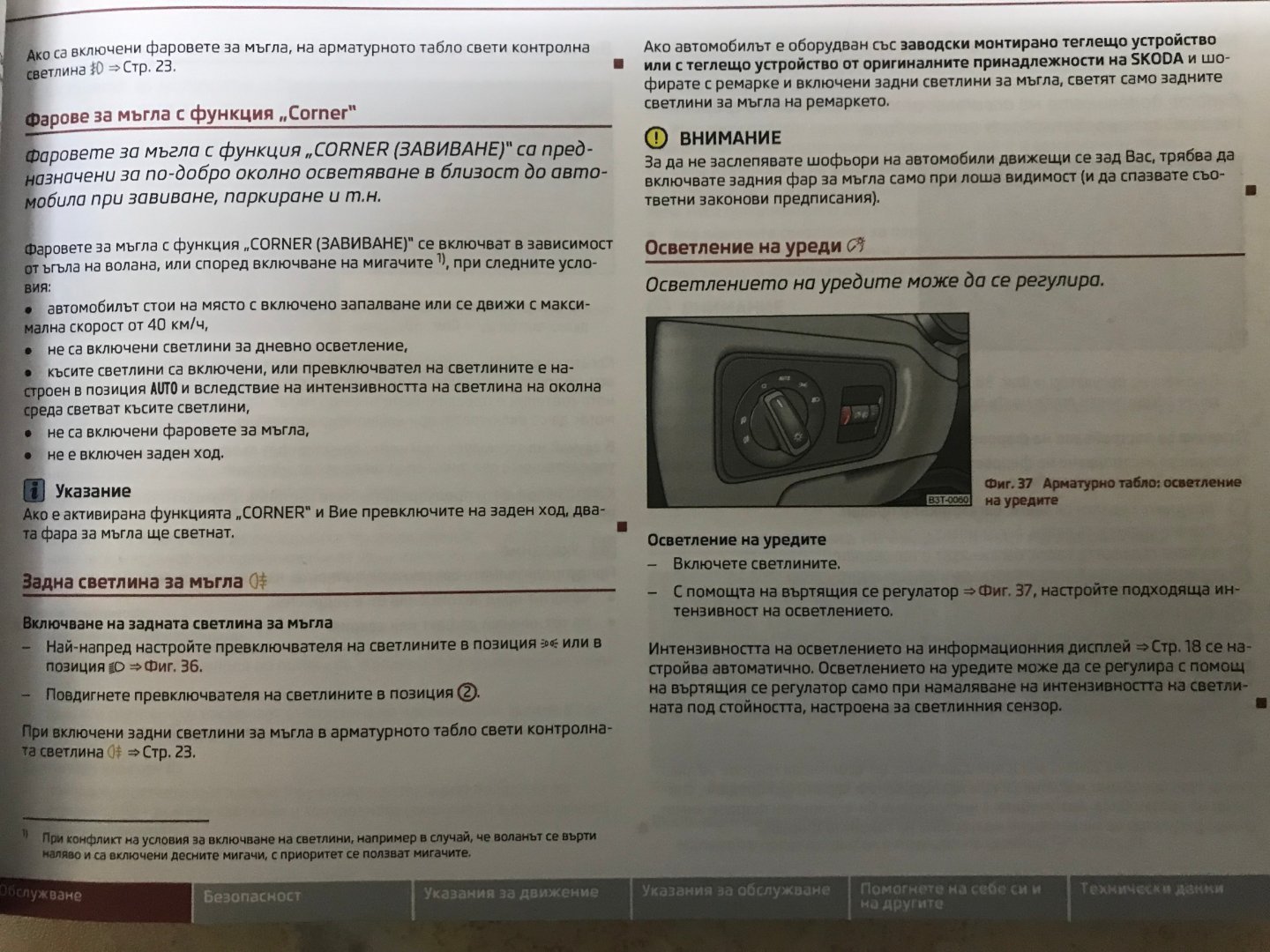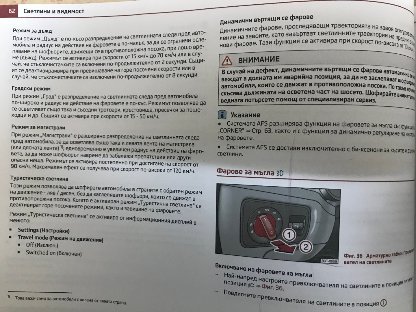 Надявам се да помогна по темата. Снимах от ръководството. Третата страница е бонус, за халогените. Забелязал съм, че при спиране зад кола на светофар късите падат надолу. Малка неточност. Сега разбрах от прочетеното, че съм с би-ксенон.