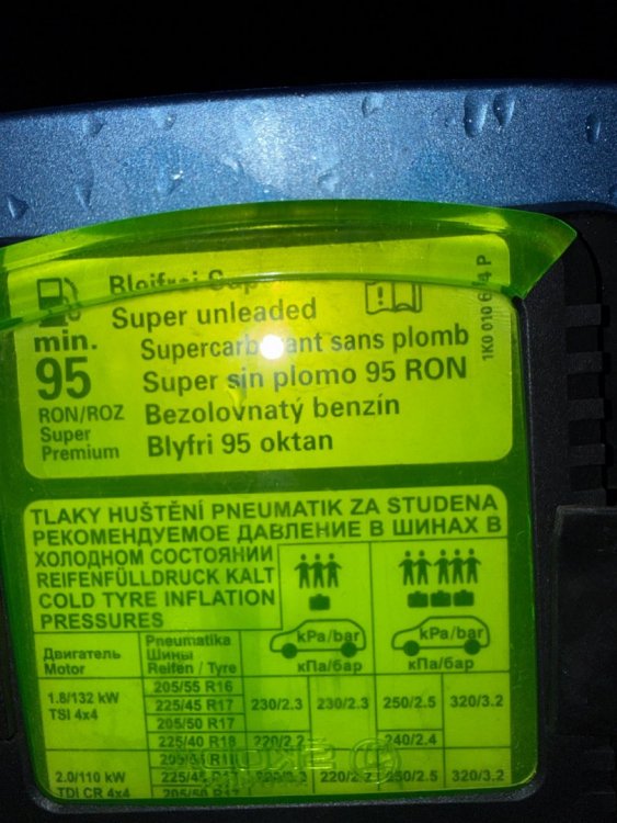 Както виждаш 98 е показано като основно, а в скоби е 95, като компромисно или заместител. На моята 1.8 тси е 95, но карам със 100 в БГ и в ГР с 95 (но 95 в ГР е минимум 97 октана, в БГ е минимум 93 по спомен за написаното в документи за доставките). Да караш с 95 в БГ не е ОК според мен тая кола. Карам в със 100 октана на Шел или 98 на други в БГ и ми харчи повече, и върви по-малко от 95 на Етека в Гр моята. Ето ти снимка на капачка на резервоара