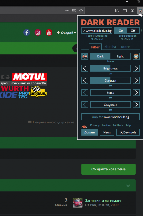 Новата версия изглежда яко и има интересни неща, супер @joro_kem Относно черната тема за десктоп - на firefox и chrome може да се добави Dark Reader и всеки сайт, който отваряш става с черна тема, не само Шкода форума. Може да се спира и пуска. Разбира се има и минуси - може да има леко забавяне или някои неща да не се визуализират напълно ОК, но рядко. Лично аз го ползвам постоянно, защото чета много текст на компютъра и белите/светлите сайтове ми вадят очите, особено вечер. Ето пример от Firefox:4 points