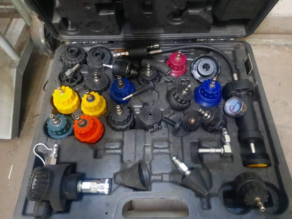 3. Огледай добре пластмасовите фланци по мотора често гумените уплатнения стават на камък и започват да сълзят по малко. Другия вариант е да се надуе системата и гледате от къде ще избие. Аз ползвам ето такава помпа :