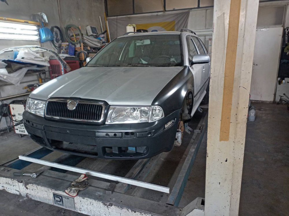 7. Много хора биха казали, че сме луди дето се захванахме. Но този модел шкода ми е любим. Двигателя не беше засегнат и решихме да пробваме. А от снимките се вижда резултата. А ето така изглеждаше преди да я оставим на майстора: Майстора я взе и разглоби за да и оцени състоянието: Роговете са на буква Г. А тук вече е на стенда за изпъване: А ето тази снимка ме развълнува много. Отново приличаше на кола. А крайния резултат е зашеметяващ. Тази Октавия възкръсна от мъртвите.