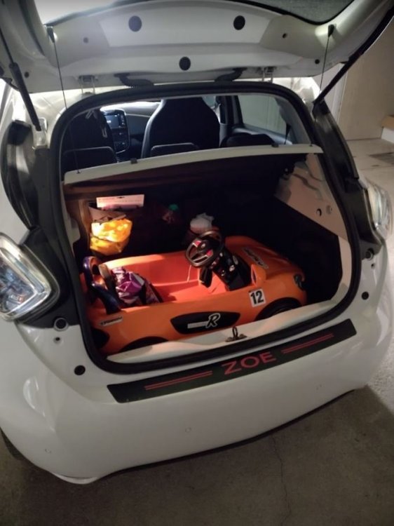 1. Моето Зое е с 41 kwh батерия и ето тук могат да се видят точни статистики за пробега му в различни условия. Ако допуснем, че по магистралата ще харчи около 19 kwh на 100 км, то едва ли ще мога да мина повече от 200 км със скорост над 110 км/ч. Също така колата е ограничена на 140 км/ч - при спускането от Вакарел до София и педал до долу в нормален (не Еко) режим, повече от 141 км/ч на километража не видях. Поне няма опасност да те снимат с превишена скорост на магистралата . Всяка жаба да си знае гьола - тази кола е доста практична за града заради размерите и икономичността си, а извънградско би ставала по-скоро за маршрути с повече завои и с по-ниска средна скорост, където пробегът спокойно може да бъде и над 300 км. Относно генерирането на ток при спусканията - батерията на 99% ми "предсказваше" пробег 279 км. Това е на база усреднена сметка за някакъв дълъг период на ползване на колата назад във времето и би могло да се занули, но не съм го направил, откакто я купих. От София до Петрохан пробегът беше паднал на 155 км, което по груба сметка май се пада около 56%. На Монтана имаше оставащи 243 км пробег, което пак по грубата сметка би трябвало да е около 87%, то ест от Петрохан до Монтана съм вкарал около 30% допълнителен ток в батерията. За сметка на това от Монтана до Лом (около 60 км разстояние) карах на круиз контрол с 90 км/ч и няколко пъти изпреварвах по-бавни коли, та в този участък не съм се възползвал изобщо от рекуперация и разходът скочи доста - стигнах в Лом с около 45% батерия. Предполагам, че ако бях карал без круиз контрол и се бях възползвал от каране по инерция при спусканията можеше да стигна с доста по-добър процент батерия в Лом. Иначе като пространство - въпреки малките си размери колата има нормален багажник (338 литра го дават, но е с добра дълбочина, предвид че успях да събера детската електрическа кола, което може да се види на прикачената снимка). За сядане също има достъчно място за 4 възрастни. Има и колан за пътник по средата на задната седалка, та и за 5 може би ще стане ако са по-финни. Има Isofix на 3 седалки - две отзад и на предната пасажерска.