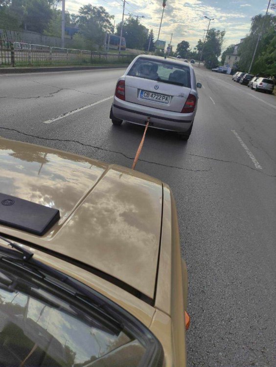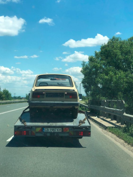 Здравейте, приятели! Мина цяла година, откакто колата се върна от бояджията. Уж за малко, но опасенията ми се оказаха вярни - човека ме окачи на пирона, и ме остави да се спасявам. Огромно приключение се оказа намирането на тенекиджия/бояджия, който да пожелае да се занимава с вече започната кола. Тук е момента да благодая на всички,които ми помогнаха в избора и намирането на майстор. Голямо приключение беше, никой не иска да я бара тази кола. Развиха се благополучно нещата, и се намери желаещ да я работи. Далече е от Пловдив, на около 80 км, но това в случая никак не е важно. Важното е, че колата вече е при него и лека-полека работата започва. Няма да изпадам в подробности за приключенията по намирането на майстор, а направо ще разкажа за закарването и до гаража. Разбира се, и тук имаше спънки, но всичко приключи благополучно. Реших да не наемам пътна помощ, а сам да си я закарам. Нужни ми бяха три неща - кола с теглич, платформа, и "Е" категория. Първата точка я отметнах сравнително лесно - имам голф 2, за който реших, че ще е влачещата кола. Беше и там леко приключение с намирането на теглич - оказа се трудна работа, в крайна сметка не успях да намеря и да си купя, а монтирах един временно, за да си свърша работата. Втора точка също не мина по вода. В Пловдив се оказа трудно наемаето на платформа - нямаше свободни. Единствената свободна беше на един зверски неточен и несериозен човек, заради който загубих цял ден на себе си, и на момчето, което взех с мен да кара, понеже нямам категория. Много нерви, 6 часа чакане за самата платформа, празни обещания, както и да е, отказах се от него. Преглътнах загубения ден, и продължих търсенето. Една седмица по-късно чрез приятел намерих друга платформа, за щастие там спънки нямаше. Трета точка - категория "Е". Проблема все още не е решен,тепърва ще карам курс. За щастие имам добър приятел, който ми угажда на акъла и ме вози Така, към същността на нещата - една вечер след работа закачихме платформата и я прибрахме в цеха. През деня бях изкарал шкодата да е готова да се качва: Ето и малко от проблемите, създадени от двугодишното чакане и прецакването от първия бояджия: така, прибрахме се привечер с голфа в цеха, и натоварихме колата: На следващия ден работхме до обяд, тъй като и двамата нямахме възможност за втори ден отпуска. Към 12 тръгнахме, ето и малко снимки по пътя: Бяхме на абсолютния лимит на товароносимост на голфа - по документи му дават 2700 кг, ние бяхме някъде към 2600. Машинката се справи без проблеми, единствено карахме малко по-бавно, 60-70 км/ч, по карловския път догонихме и някакъв военен конвой, който се движише с 30-40, и карахме още по-бавно. Странното беше, че другите шофьори освиркваха и псуваха нас, а не военните пред нас, но все тая След сравнително дълго пътуване, най-накрая пристигнахме: Свалихме колата, и вече е в новия си временен дом: и така, за момента това е положението. Надявамсе скоро да има още какво да кажа по развитието на проекта12 points