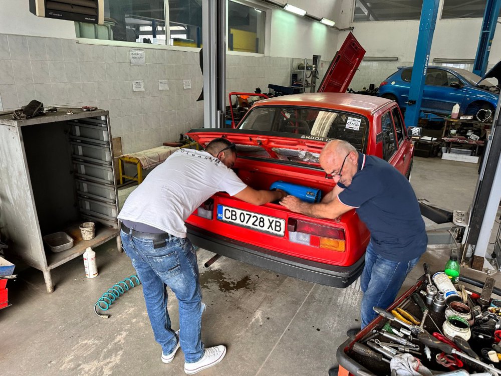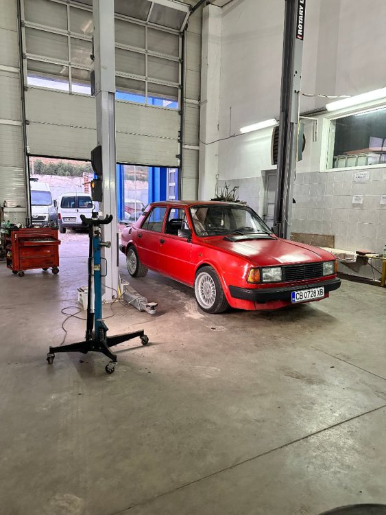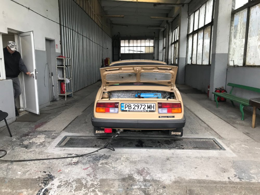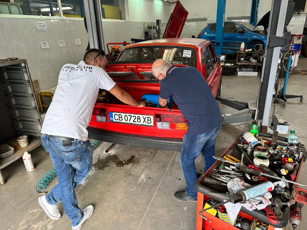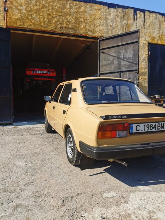 И такааа, както може да се досетите по снимките, които качвам, когато на някоя сбирка има задномоторка, тя винаги получава много специално внимание от моя страна. Баща ми преди фелата имаше 120ка и от няколко години насам и аз много искам. В интерес на истината от доста време следя обяви и си бях казал, че тази година ще купя една по повод, че скоро навършвам пълнолетие. Обаче така се завъртяха нещата, че донякъде тя ме намери. От миналото лято я гледам пред сервиза с идеята, че е поредният недовършен и изоставен проект: (снимка от миналата година, гледаме колата в дъното, а сглобената 105чка си има друг собственик, но и там е голяма лудница) Та, един ден по време на обедната почивка, аз както винаги си мрънкам за цените по обявите, шефът ме чу, врътна набързо два телефона иии... - обещаха ми кола! Шкодичката в 120l 1990г. на реални малко над 40к км, купувана е от Германия и е докарана тук 1994г. Собственикът почива и реално брат му се заема с колата. Докарана е до Люси, разглобена е изцяло с идеята за пълна реставрация, но това така и не се случва. Колата седи години наред така до началото на този септември. Уговорихме се с човека, че двигателят трябва да се качи, за да може да се мине през КАТ и колата да се оправи документално от негова страна. Това малко се проточи във времето, защото идната седмица имах доста ангажименти: В първият удобен момент успяхме да я отворим и да я изкараме от трънаците, понеже още нямаше ключ: Първа баня: Една добра идея да припомпим 30+ годишни напукани гуми за да бутаме по-лесно и ПАА, започваме с летящ старт и малко псувни:)) Както и да е, качихме мотора, но не ми беше достатъчно и реших, че така и така ще се качва, искам и да пали. Оказа се, че стартерът е починал и докато си купя друг, Ивчо @__smirnoff__ беше така добър да ми даде назаем: Запалихме, поиграхме си малко с настройката на запалването и започна да звучи добре горе-долу. Добре, но запалил съм я, бива ли да не мога да врътна кръгче с нея... Последваха качване на елементите на охладителната система, наливане и обезвъздушаване с вода и отстраняване на няколко теча, които се появиха своевременно. Помпичката на съединителя , която е на кутията беше изцяло запекла - смених я с чисто нова, като с това смених и спирачната течност. Дойде време за първото каране, което от сегашната ми гледна точка беше много неприятно относно усещане на колата, но го имаше все пак. Няколко пъти така изкарване от сервиза и вкарване на ход и започнах да губя съединителя, а в краката се появи една локва - и горната помпичка беше заминала. Купих си ново бутало и за резерва два комплекта само гумички. Лека полека взе да става много приятна. Понеже започнах да усещам за липси по колата реших лека полека да започна да я сглобявам, за да разбера какво ми е нужно. Започнах да си оставам редовно извън и работно време: Чат-пат бабата спеше на топло: Взе да добива вид, макар и всичко отвън да е хванато на половината болтове само, за да си го представя: Поиграх си и вкарах фелициевите седалки вътре макар, че искат още малко занимавка за да ми харесат: Дойде и момента, официално да купя колата, да получа ключ и вече да съм сигурен, че сериозно мога да се захващам с нея: Вече си купих мой стартер и започвам да се оглеждам какво ще ми потрябва за да я направя комплектна. Днес @joro-120L ми беше малко на гости, поиграхме си с настройка на карбуратора, изч