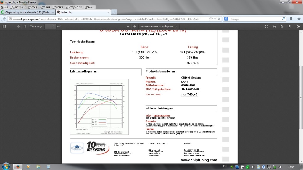 на Racechip,APR,DTE,ABT. Резултата е,че единствено АВТ,ми предоставиха инфо,което ме удовлетвори.Другите си закачат модулите към датчика на всмукателния колектор и лъжат стойностите които отиват към компютъра в рамиките на позволеното от оригиналния софтуер-което е малко.Единствено АВТ,ти пращат изцяло нов компютър,който се закача за оригиналните букси на стоковия.Вдигат както горивото,така и налягането на турбото.Всички останали са ташак малко. Е и цената от 4580лв. е соленка,но съм надъхан.И аз мога да я чипна,но по компа ще останат видими следи,а той е открит и е до акумулатора-много се вижда и ако нещо стане,ме предупредиха от ЕТ,че ще гледат дали не е пипан.Защото ме знаят,че правя такива неща.А не смятам да рискувам,5 години ако нещо стане,те са с топката.Много е нов двигатела и не изключвам бъдещи проблеми.Да си ги отстраняват.